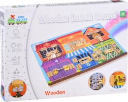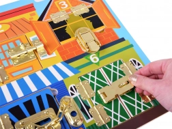 Różnorodne mechanizmy – od haczyka, przez zamek przesuwny, po klamrę czy klips – motywują do samodzielnego próbowania i powtarzania. Nagrodą za każdy pomyślnie otwarty zamek jest ilustracja uroczych zwierzątek, która pobudza ciekawość i radość z odkrywania.