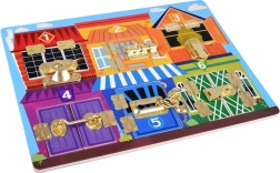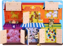 Ta interaktywna tablica manipulacyjna zapewni dzieciom mnóstwo zabawy i nauki w jednym. Każdy kolorowy domek jest oznaczony numerem i skrywa za drzwiczkami zwierzątka w liczbie odpowiadającej danej cyfrze. Dzieci w ten sposób poćwiczą liczenie, rozpoznawanie kolorów oraz myślenie logiczne, a otwieranie różnych zamków wzmocni motorykę małą i koordynację oko–ręka.