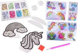 Stwórz 2 duże dekoracje do postawienia lub powieszenia oraz 12 brokatowych naklejek z motywami tęczy i jednorożców. Idealne na okna, zeszyty i prezenty.