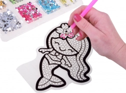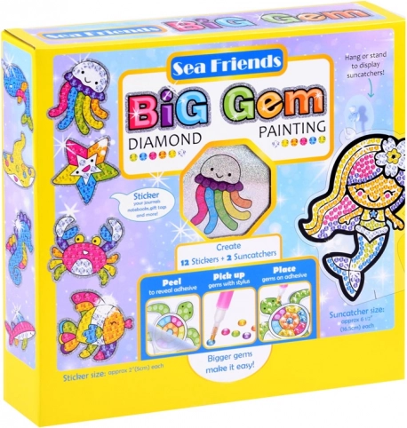 Ten zestaw Diamentowe malowanie Sea Friends pozwoli dzieciom stworzyć błyszczące obrazki morskich przyjaciół. Wystarczy odkleić folię ochronną, nabrać kamyczek aplikatorem z woskiem i zgodnie z kolorami umieścić go na naklejce lub szablonie z klejem. Jeśli kamyczek przyklei się nieprawidłowo, można go łatwo przemieścić przed zaschnięciem.