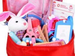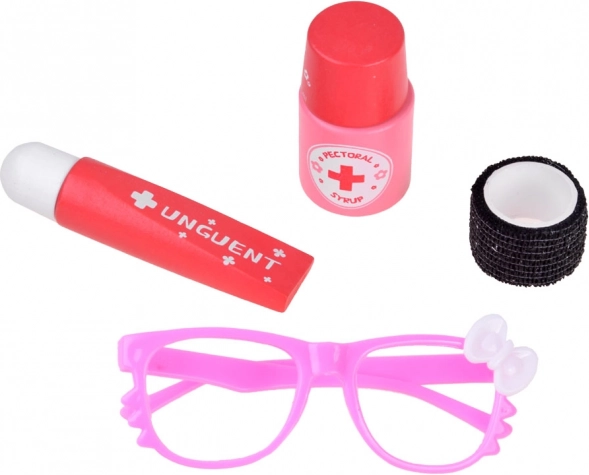 Uwaga: wszystkie elementy są rekwizytami. Podczas zabawy nie wkładać „leków” ani innych drobnych części do ust. Kolor/wzór pluszowej króliczki może się różnić.