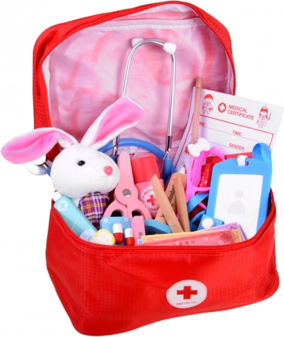W komplecie znajduje się także termometr z wymiennymi dyskami, strzykawka, nożyczki, pęseta, bandaż, plastry, „leki” w tabletkach i kapsułkach (rekwizyty), syrop i maść w tubce, karty pacjenta oraz książeczka lekarska. Wszystko łatwo przechowasz w wytrzymałej czerwonej apteczce z uchwytem, dzięki czemu zestaw jest idealny również w podróży i do szybkich akcji.