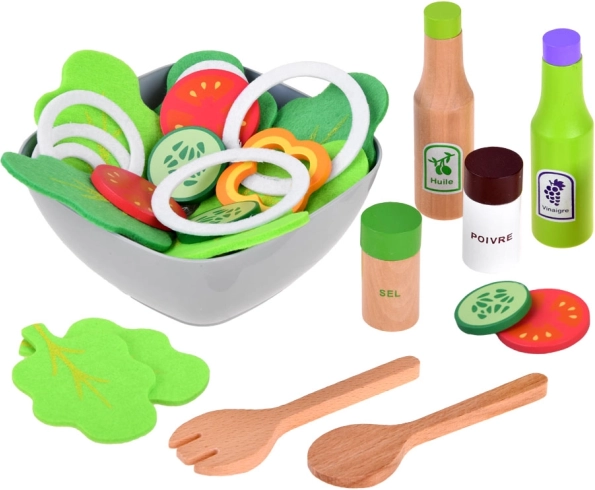 Zabawny zestaw do przygotowywania sałatki z drewnianych i tekstylnych składników