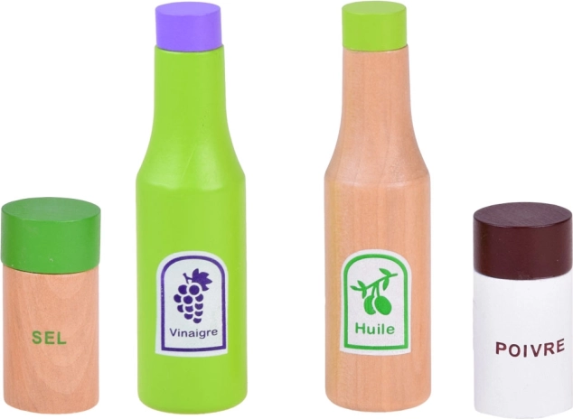 - Plastikowa miska; 2 drewniane buteleczki na przyprawy; drewniana solniczka i pieprzniczka; 2 drewniane łyżki do sałaty; filcowe liście sałaty; plasterki pomidora, ogórka, papryki oraz krążki cebuli