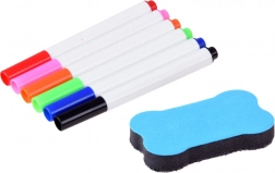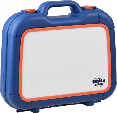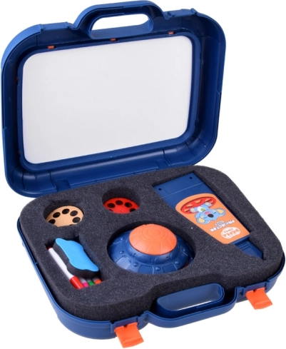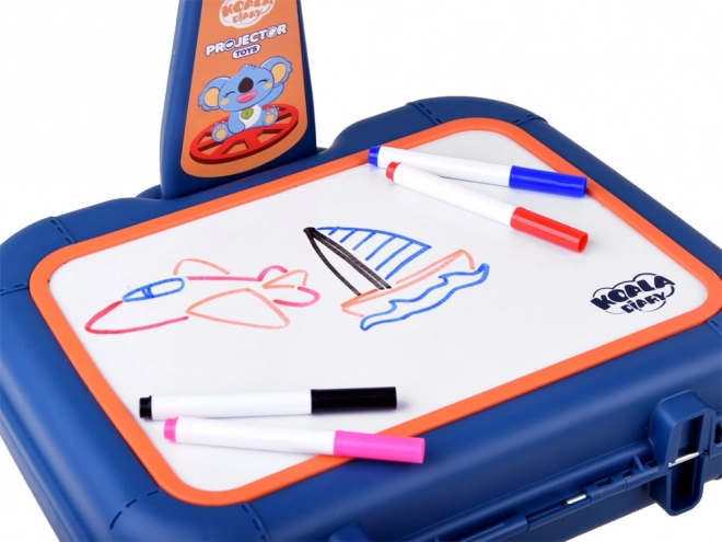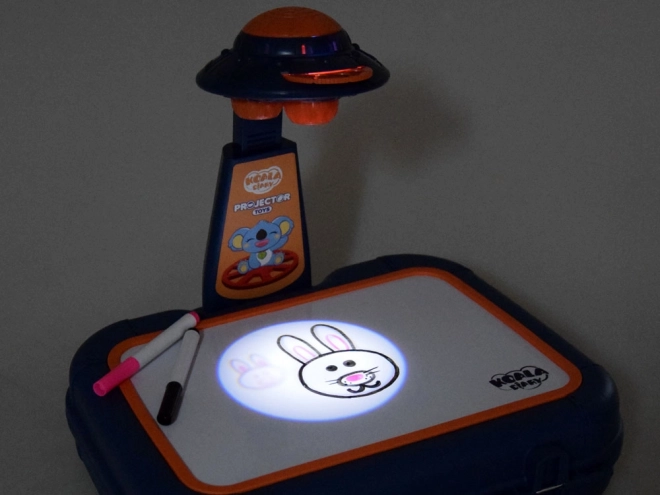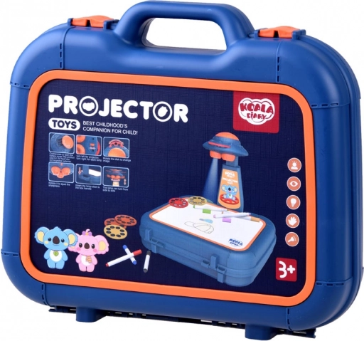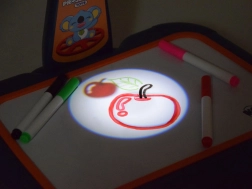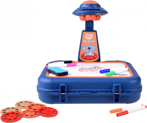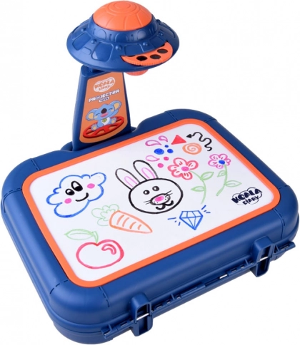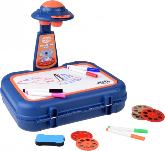 Walizeczka z powierzchnią do rysowania, projektor-lampka, regulowane ramię, 6 szablonów z obrazkami, gąbka do ścierania oraz 6 pisaków.