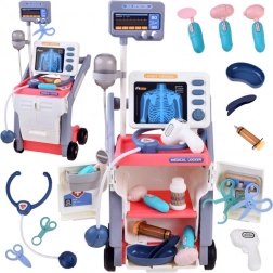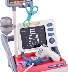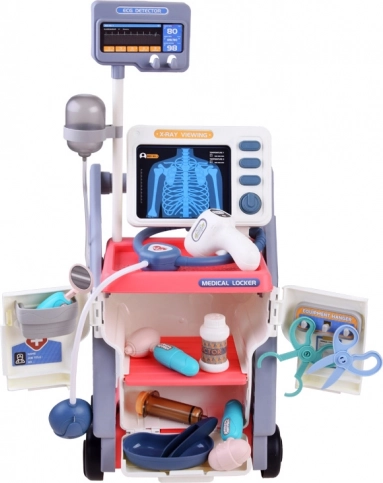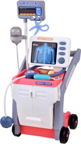 Zestaw zawiera wózek z kółkami, stetoskop, kroplomierz, termometr, otoskop, młoteczek neurologiczny, strzykawkę, lusterko i inne.
