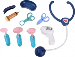 Zestaw zawiera różne przyrządy lekarskie, takie jak stetoskop, który dzięki już zamontowanym bateriom emituje dźwięk bicia serca, czy termometr, który po naciśnięciu wydaje krótki dźwięk i zapala się.