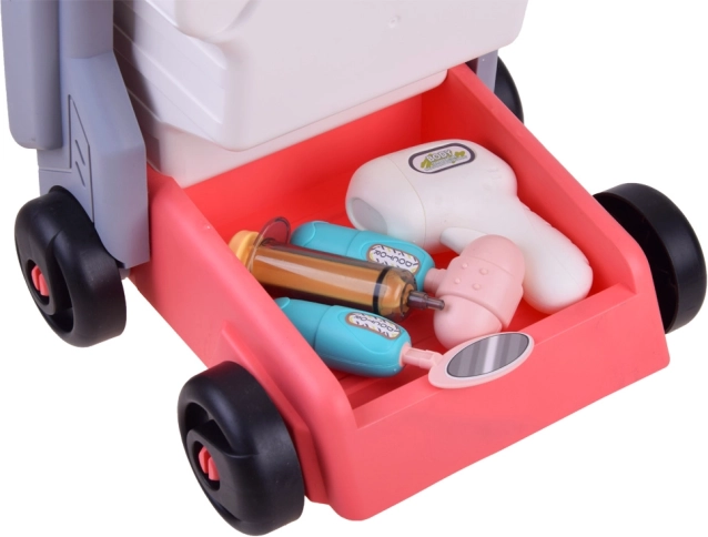 Ten lekarski wózek jest wykonany z wysokiej jakości plastiku i zaprojektowany do kolorowej i zabawnej gry. Wszystkie przyrządy są wiernymi imitacjami prawdziwych narzędzi medycznych i mają przyjazne kształty oraz wesołe kolory.