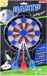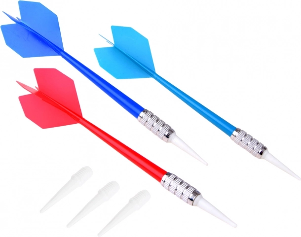 Zestaw zawiera trzy lotki z metalowymi uchwytami i białymi plastikowymi końcówkami, idealne do bezpiecznej zabawy w pomieszczeniach.