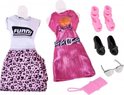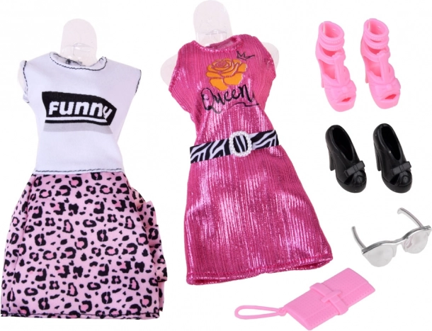 Zestaw zawiera różne rodzaje ubrań i akcesoriów, takie jak sukienka w panterkę oraz stylowe torebki.