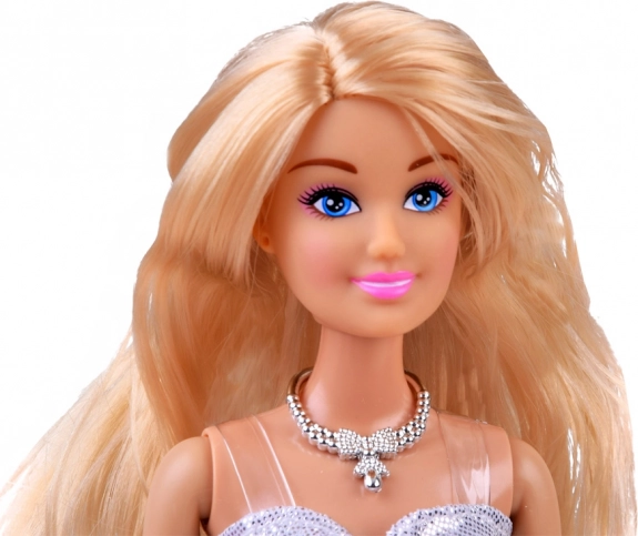 Lalka jest ubrana w elegancką srebrną spódnicę i nosi piękny naszyjnik, co podkreśla jej modny wygląd.