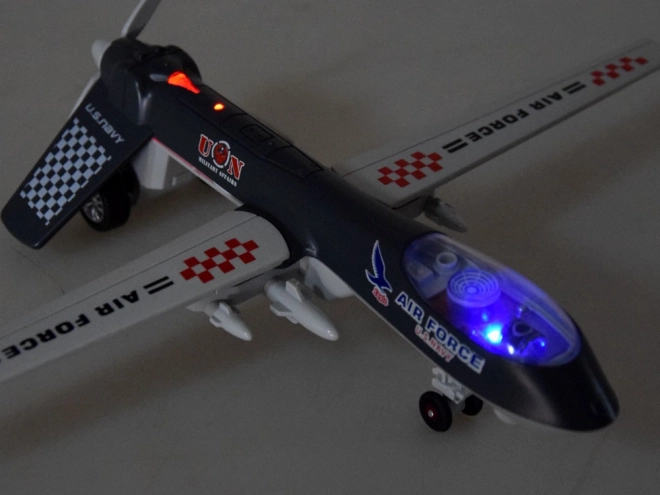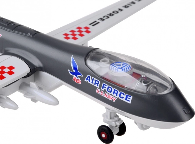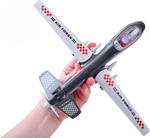 Umieszczenie zabawki na równej powierzchni uruchamia funkcje dźwiękowe i świetlne. Usłyszysz odgłosy rozruchu i pracy silników, strzały, dźwięki walki, a kabina i ogon zostaną oświetlone. Dron jest estetycznie wykonany z dbałością o detale.