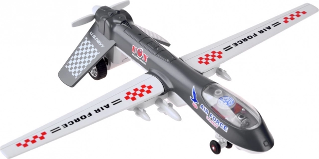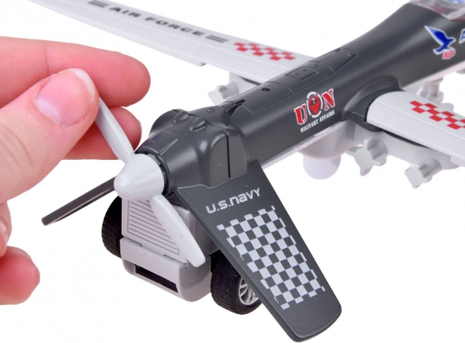 Model wojskowego drona to świetna zabawka dla wszystkich zainteresowanych techniką wojskową. Wykonany z metalu i plastiku, dostępny w neutralnych, maskujących barwach, wyposażony w składane skrzydła i ruchome śmigło. Kluczową cechą jest napęd typu „pull-back” – po prostu pociągnij zabawkę do tyłu i puść, aby ruszyła do przodu. Gdy dron nabierze prędkości, aktywuje się także śmigło, które zaczyna się obracać.