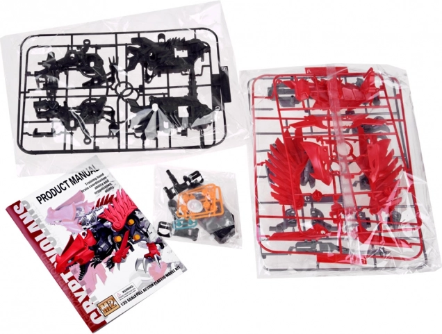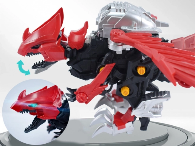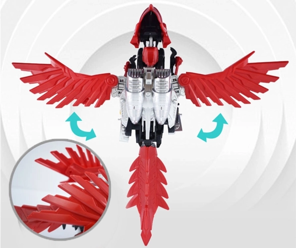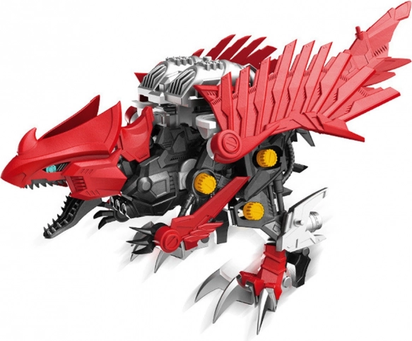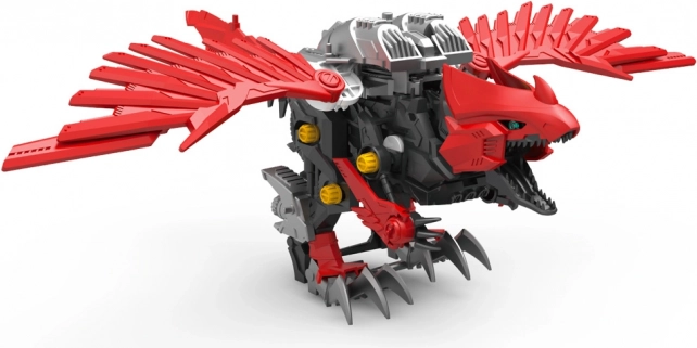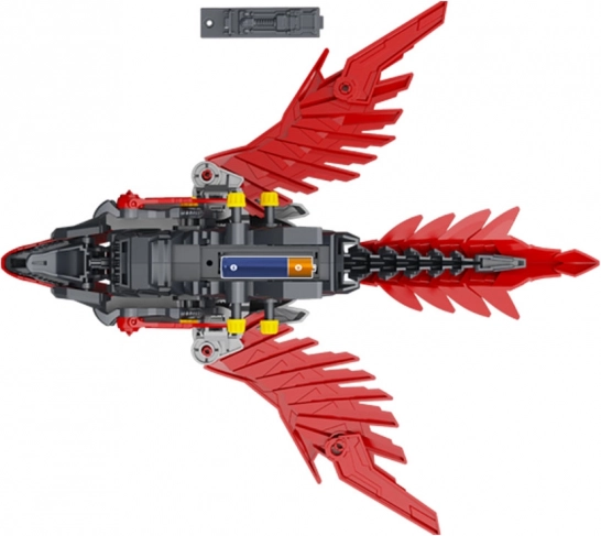 Po złożeniu raptor ożywa: macha skrzydłami, otwiera paszczę i porusza ogonem. Mechanizm zasilany 1× AAA zapewnia dynamiczną zabawę i efektowną prezentację modelu.