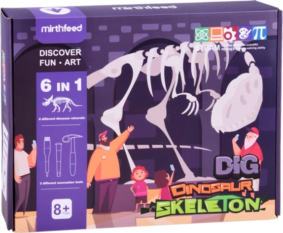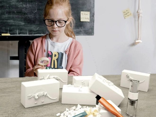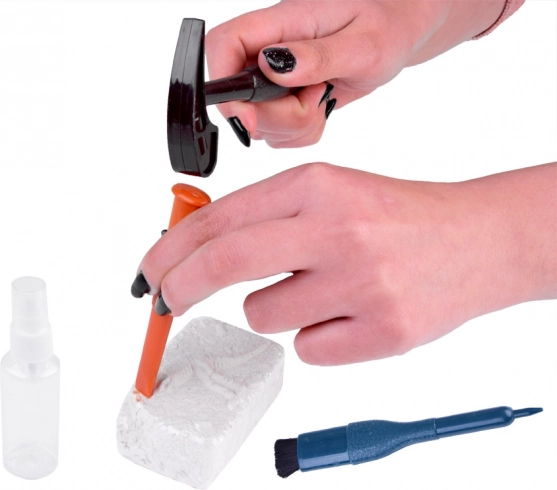 Zestaw idealnie sprawdzi się jako kreatywny i edukacyjny prezent dla ciekawych świata dzieci. Procedura jest prosta: zwilżyć, ostrożnie odkrywać dłutem i młoteczkiem, zmieść pył pędzelkiem, a na końcu złożyć szkielet. Efektem jest mała domowa kolekcja sześciu modeli dinozaurów.