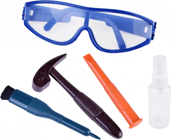 Dłuto, młoteczek, pędzelek, spryskiwacz i okulary ochronne – kompletny zestaw dla małych odkrywców, który rozwija motorykę małą i koordynację.