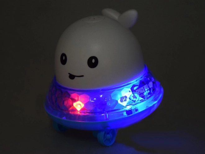 Poza wodą zabawa trwa dalej: umieść wieloryba na platformie, włącz i obserwuj jazdę w rytm wesołej muzyki i świateł.