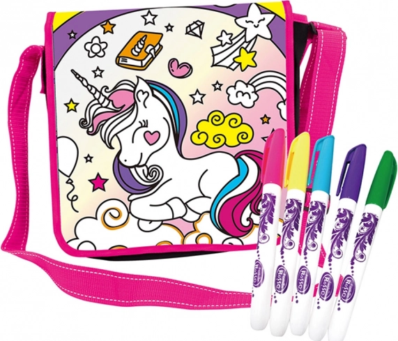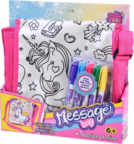 W zestawie znajdują się kolorowe pisaki o długości 14 cm (niebieski, różowy, fioletowy, zielony, żółty), które świetnie kryją i łatwo się wypierają. Torba o wymiarach 23 × 23 × 5 cm jest idealna na drobiazgi do szkoły, na zajęcia i na wycieczki.