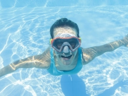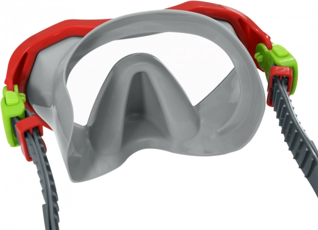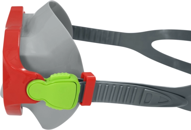 Poliwęglanowa soczewka z filtrem UV chroni oczy przed słońcem także podczas pływania przy powierzchni. Regulowany, dzielony pasek umożliwia szybkie i precyzyjne dociągnięcie do różnych rozmiarów głowy, dzięki czemu maska pozostaje na miejscu nawet przy skokach do wody.