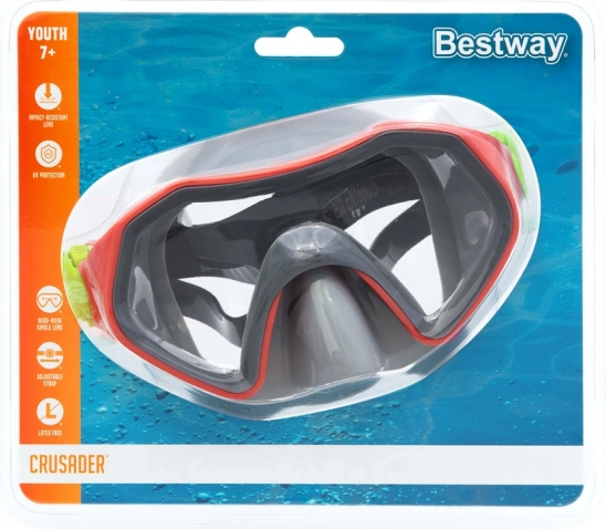 Zapewnij dzieciom bezpieczne i radosne pierwsze kroki pod wodą. Maska Bestway Crusader łączy wytrzymałe materiały bez lateksu z komfortową uszczelką, która skutecznie zapobiega przedostawaniu się wody. Dzięki wyrazistym kolorom maska jest dobrze widoczna w wodzie i łatwo się ją zakłada.