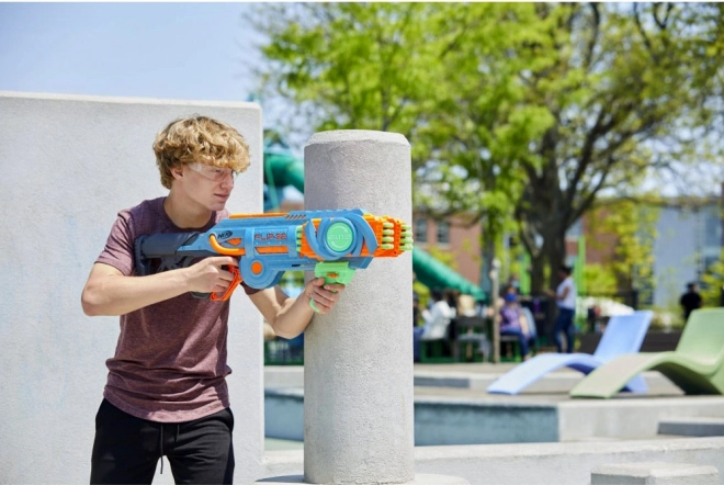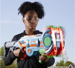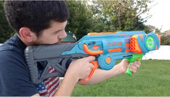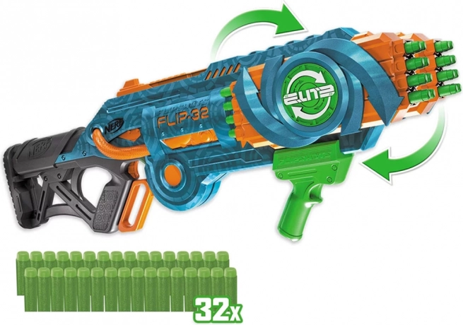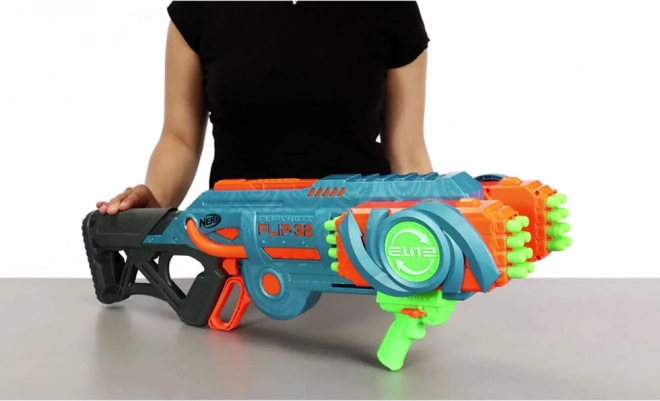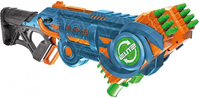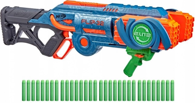 Blaster Nerf Elite 2.0 Flip-32 jest wykonany z wysokiej jakości plastiku, a pociski z bezpiecznej pianki z gumowymi końcówkami. System obrotowych magazynków umożliwia elastyczność i kontynuowanie gry nawet po wystrzeleniu pierwszej serii pocisków. Wystarczy obrócić magazynek o 180 stopni i zabawa może trwać dalej. Dwie opcje strzału oferują albo pojedyncze wystrzały, albo podwójny strzał.