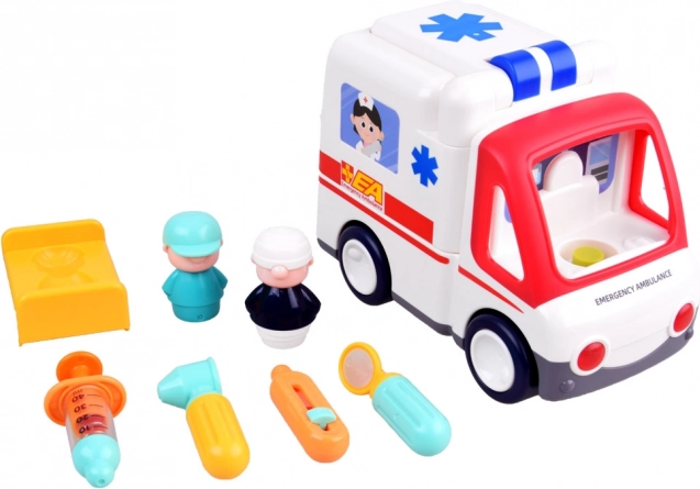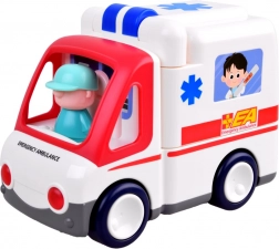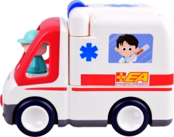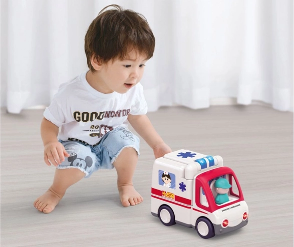 Główne cechy produktu: - Samodzielna jazda: Pojazd potrafi jeździć sam i zmienia kierunek po napotkaniu przeszkody. - Efekty dźwiękowe: Zawiera dźwięki rozruchu silnika, syreny karetki, klaksonu, wesołej muzyki oraz hamowania. Efekty świetlne obejmują migające światła. - Funkcyjny przełącznik: Pod pojazdem znajduje się przełącznik wyboru między trybem statycznym a ruchomym.