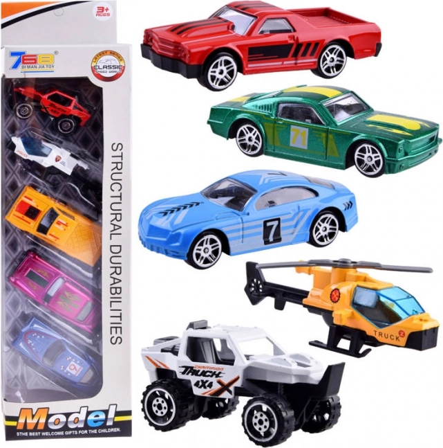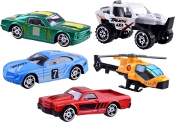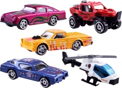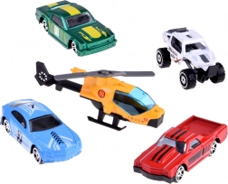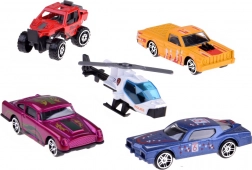 Ten zestaw zawiera trzy samochody osobowe, buggy i helikopter. Każdy pojazd ma wyrazisty design i jest wykonany tak, aby przetrwać nawet intensywną zabawę.