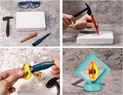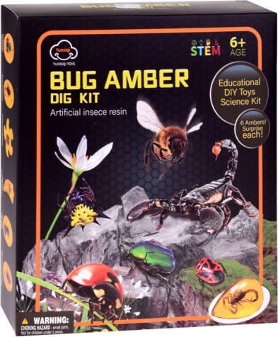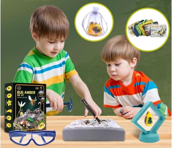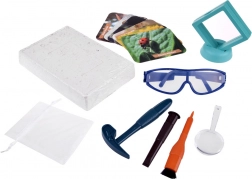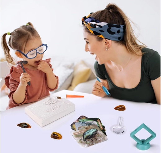 Zamień pokój dziecięcy w małe stanowisko paleontologiczne. W gipsowym odlewie ukryto 6 „kawałków bursztynu” z zatopionymi owadami, które dziecko krok po kroku odkryje przy użyciu młoteczka, dłutka i pędzelka. Bezpieczeństwo zapewniają okulary ochronne, a do szczegółowych obserwacji służy lupa.