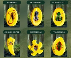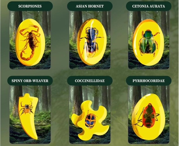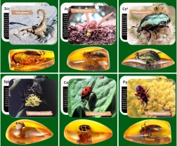 - gipsowy odlew z 6 „bursztynami”, młoteczek, dłutko, pędzelek, okulary ochronne, lupa, woreczek na skamieniałości, stojak, 6 kart z owadami (EN)