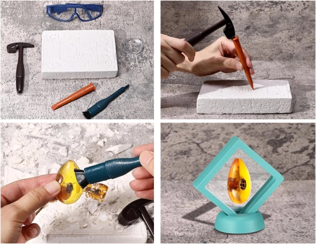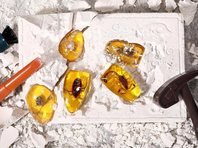 Gipsowy blok skrywa sześć „bursztynów” z owadami. Dzieci stopniowo je odkrywają przy pomocy młoteczka, dłutka i pędzelka – bezpiecznie i z frajdą.