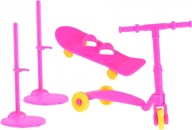 W zestawie znajdują się akcesoria kuchenne i do sprzątania oraz sprzęt sportowy, taki jak deskorolka i hulajnoga. Świetne do kreatywnych scenek.