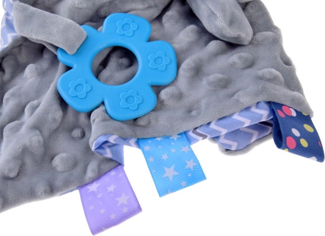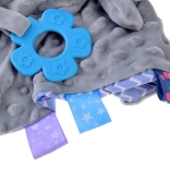 Ta mięciutka przytulanka łączy w sobie kocyk do tulenia, zabawkę i praktyczny gryzak w jednym. Różnorodne faktury materiału oraz kolorowe metki zachęcają do dotykania, ugniatania i poznawania, a delikatne piszczące i szeleszczące elementy wspierają rozwój słuchu.
