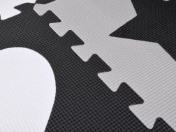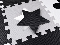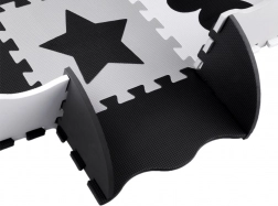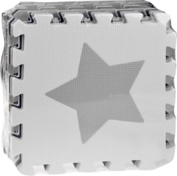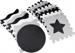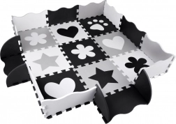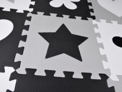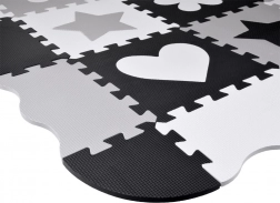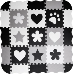 Stylowa i bezpieczna dziecięca mata z piankowych puzzli w odcieniach szarości, czerni i bieli stworzy miękką i higieniczną przestrzeń do zabawy. Zestaw zawiera 16 dużych elementów z wyjmowanymi kształtami, powierzchnią antypoślizgową oraz izolacją termiczną. Dzięki możliwości łączenia także w pionie można stworzyć mały kojec/skorygowaną przestrzeń na zabawki lub piłeczki.