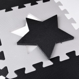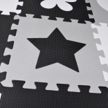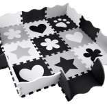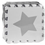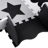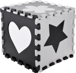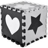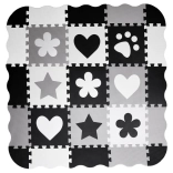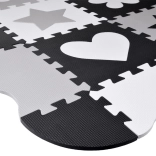 Piankowa mata do zabawy z pianki EVA chroni przed chłodem podłogi, amortyzuje upadki i wspiera rozwój małej oraz dużej motoryki. Neutralny, kontrastowy design z serduszkami, gwiazdami i innymi kształtami pasuje do każdego pokoju dziecięcego i salonu.