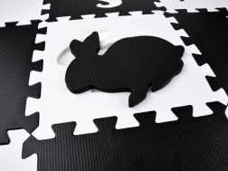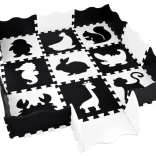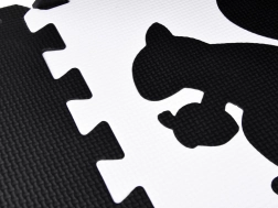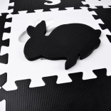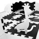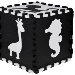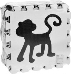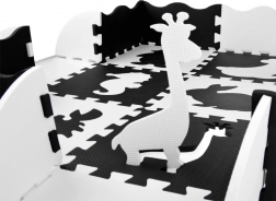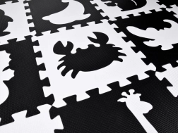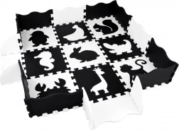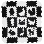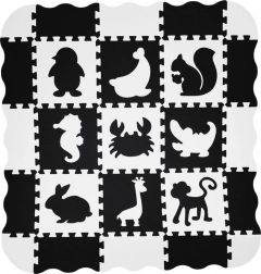 Ta kontrastowa mata piankowa z motywami zwierząt łączy nowoczesny wygląd i praktyczność. 16 miękkich elementów o wymiarach 30 × 30 × 1 cm łatwo ułożyć w format 120 × 120 cm lub dopasować do przestrzeni. Niektóre płytki mają wyjmowane elementy środkowe, które wspierają małą motorykę oraz naukę kształtów i zwierząt.