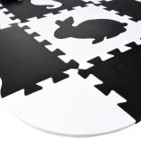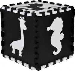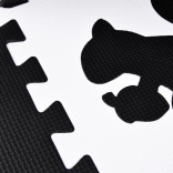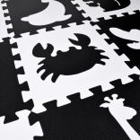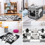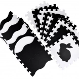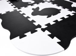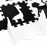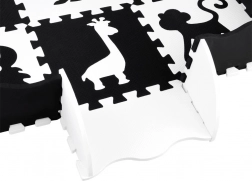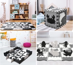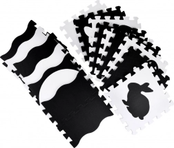 Stylowa czarno‑biała mata piankowa z 16 elementów tworzy bezpieczne i wygodne miejsce do zabawy dla niemowląt i starszych dzieci. Kontrastowe kolory stymulują wzrok, miękka pianka EVA amortyzuje uderzenia, a dwustronna powierzchnia z antypoślizgową strukturą zwiększa bezpieczeństwo. Elementy można dowolnie układać, stawiać krawędzie w pionie i tworzyć zamkniętą przestrzeń na zabawki lub piłeczki.