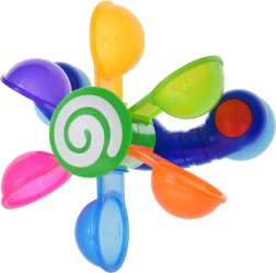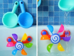 Pozwala twojemu dziecku cieszyć się zabawą z kolorowymi, ruchomymi kubeczkami, które obracają się, gdy wlewa się na nie wodę, ucząc dziecko pojęć ruchu i reakcji zwrotnej. Ta zabawka wspiera rozwój motoryczny, funkcje poznawcze i umiejętności koordynacyjne. Podczas zabawy dziecko może uczyć się kolorów, liczenia oraz wyobrażać sobie różne historie. Ta zabawka do kąpieli jest łatwa do przenoszenia i demontażu, co pozwala na jej umieszczenie na bokach wanny, prysznica lub basenu. Kolorowa tęcza kubeczków zaczyna się obracać dookoła, podczas gdy woda chlapie i stymuluje słuch dziecka.