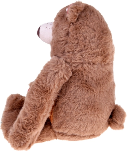 Miś pokryty jest miękkim brązowym futerkiem, które jest przyjemne w dotyku i zachęca do przytulania.