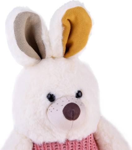 Pluszowy króliczek wykonany jest z miękkiego, mięciutkiego białego futra, które jest przyjemne w dotyku. Króliczek ma różowy brzuszek, jedno ucho i łapkę w kolorze żółtym, a drugie ucho i łapkę w szarym. Brązowy, piegowaty nos i czarne plastikowe oczy dodają jego urokowi.