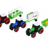 - 3 traktory w kolorze czerwonym, niebieskim i zielonym, z różnymi przyczepami do wykorzystania w działaniach rolniczych