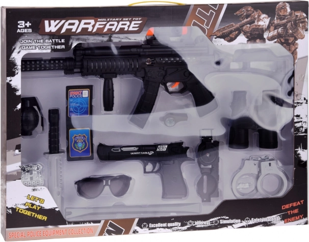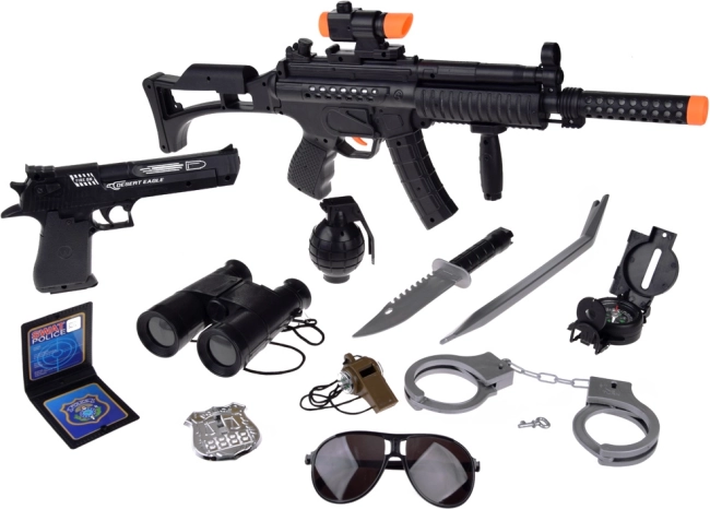 Zestaw zapewnia pełne wyposażenie do realistycznej zabawy w policjanta lub oficera wojskowego.