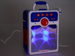 Obsługa jest prosta i bezpieczna: duży pokrętło głośności, przełącznik On/Off, przyciski do przeskakiwania i przewijania utworów oraz możliwość wyłączenia efektów świetlnych. W zestawie znajduje się przewodowy mikrofon z własnym włącznikiem, który ładnie wzmacnia dziecięcy głos. Praktyczne wysuwane uchwyty po bokach mieszczą telefon lub odtwarzacz MP3, a zintegrowana rączka ułatwia przenoszenie.