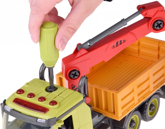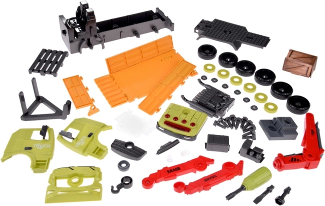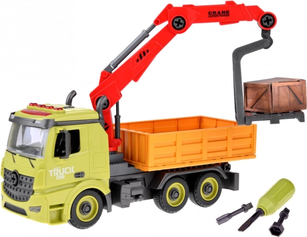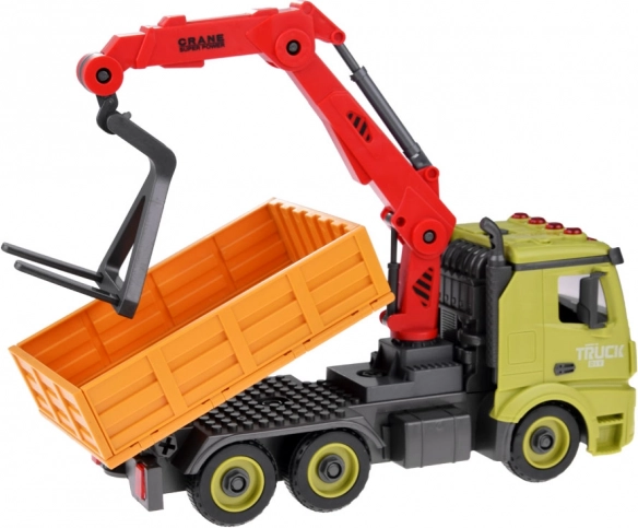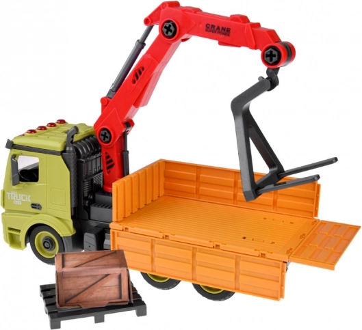 Ciężarówka budowlana z dźwigiem to doskonały wybór dla małych miłośników maszyn budowlanych, zapewniająca godziny świetnej zabawy. Auto wykonane jest z plastiku, ma żywe kolory, obrotowe, nośne ramię dźwigu oraz otwierany bok przyczepy.
