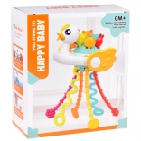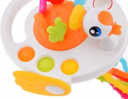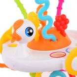 Urocza sensoryczna zabawka i gryzak w kształcie łabędzia zachwyci maluszki już od pierwszych dni. Oferuje różne faktury, sznureczki do ciągnięcia z dźwiękiem i delikatną wibracją, miękkie przyciski oraz przesuwany element do treningu motoryki małej. Kompaktowe wymiary i bezpiecznie zaokrąglone krawędzie sprawiają, że to idealna zabawka w podróż.