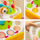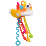 - gryzak, sznureczki do ciągnięcia z dźwiękiem i wibracją, miękkie przyciski do naciskania, przesuwny guziczek przez otwory, różnorodne faktury, nauka kolorów