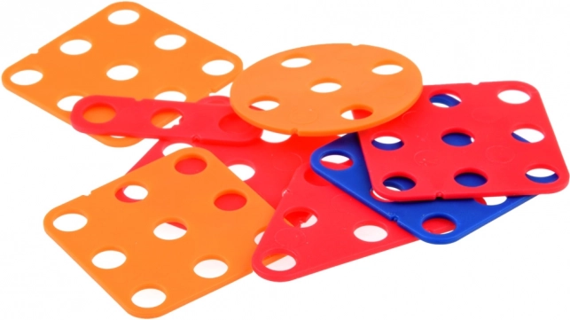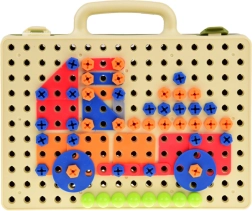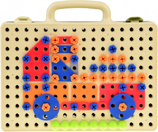 Perforowana płyta w walizce służy jako baza do budowania mozaik i modeli. Dzieci mogą tworzyć według własnej wyobraźni lub z pomocą dołączonych szablonów. Zestaw jest idealny do samodzielnej i wspólnej zabawy, rozwijającej kreatywność i cierpliwość.