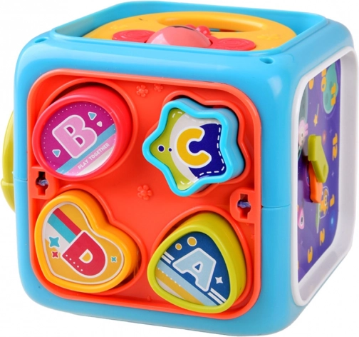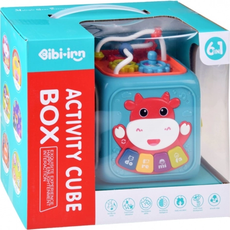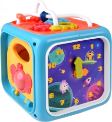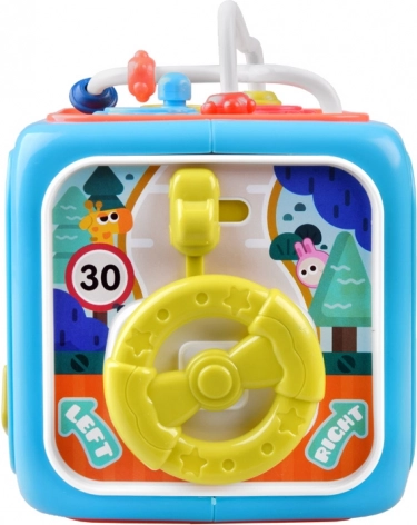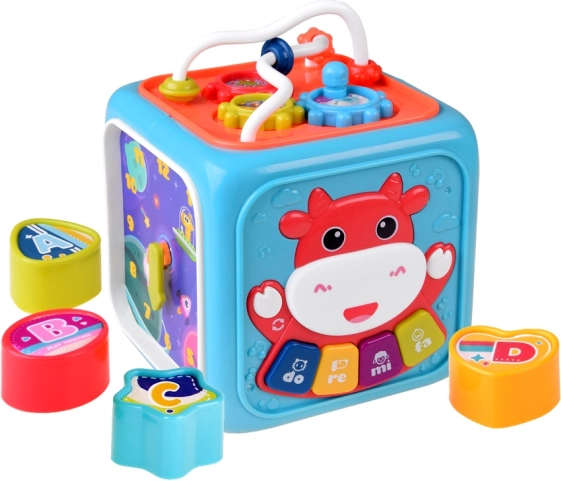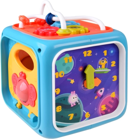 Ta multifunkcyjna aktywna kostka rozwija umiejętności dziecka poprzez zabawę. Maluchy ćwiczą sprawność manualną na labiryncie z koralikami i kółkach zębatych, uczą się sortowania kształtów dzięki sorterowi, a za pomocą zegara z ruchomymi wskazówkami mogą poznawać rytm dnia i podstawy mierzenia czasu.