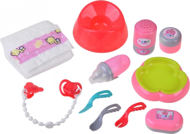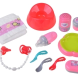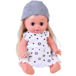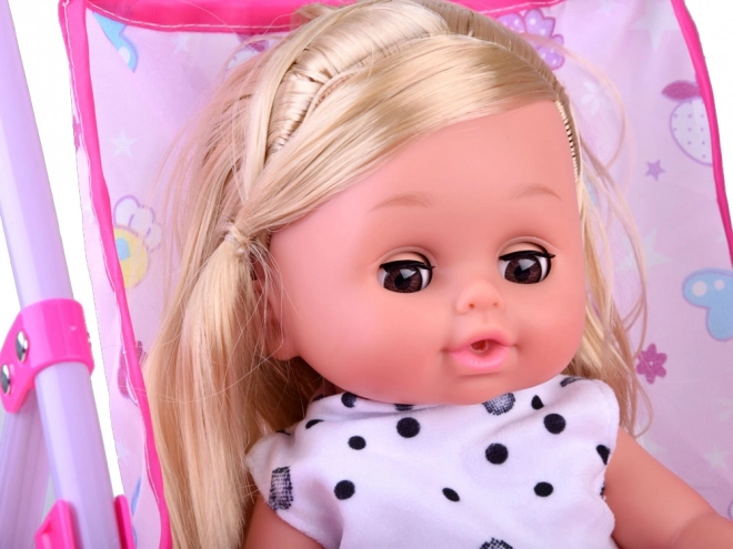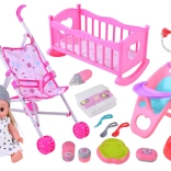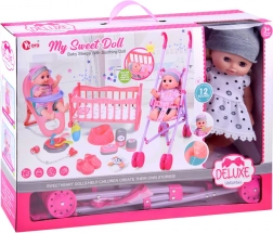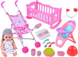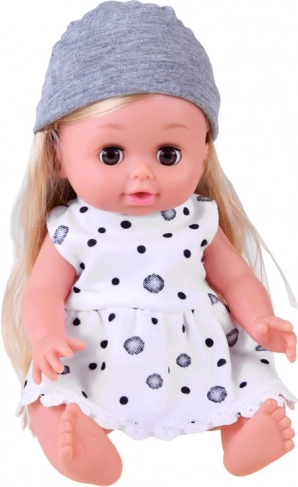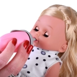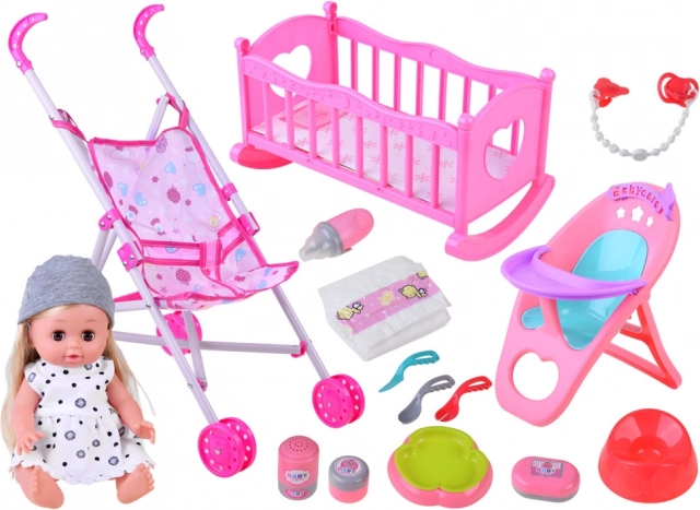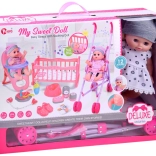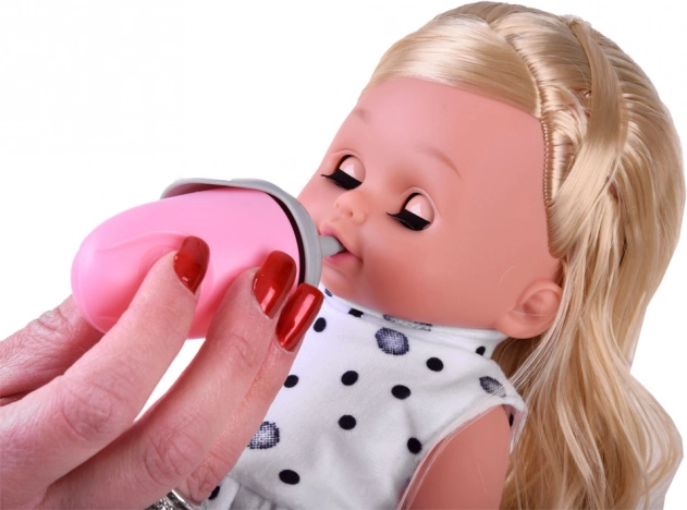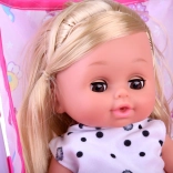 Ten bogaty zestaw dostarcza wszystko, czego dziecko potrzebuje do realistycznej zabawy w mamę lub opiekunkę. Urocza lalka z brązowymi oczami i długimi blond włosami jest ubrana w białą sukienkę w kropeczki i cienką szarą czapeczkę. Można ją karmić dołączoną butelką, ma funkcję siusiania i po położeniu zamyka oczy, więc łatwo zasypia w dołączonej kołysce.