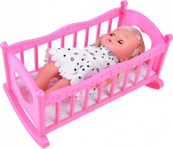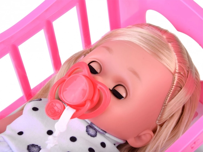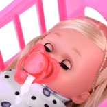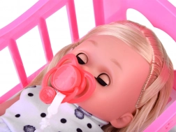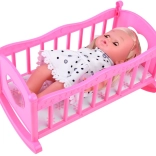 Po karmieniu możesz ułożyć niemowlę w różowej kołysce. Lalka zamyka oczy i łatwo „zasypia”.