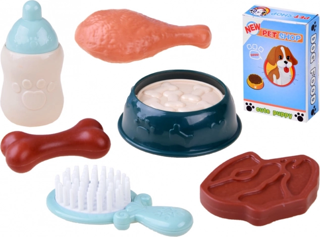 W zestawie miska z imitacją karmy, butelka, szczotka, kość, udko z kurczaka, stek, pudełko z karmą oraz naklejki – wszystko do realistycznej opieki.